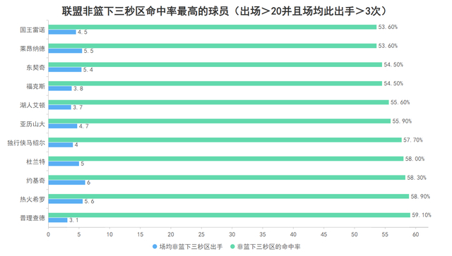 在联盟场均非篮下三秒区出手3次以上的球员里,莱昂纳德53.6%的非篮下三秒区命中率位于联盟第十高,他在这个区域的终结表现虽然达不到最为顶尖的层次但也是联盟的最高档次;
